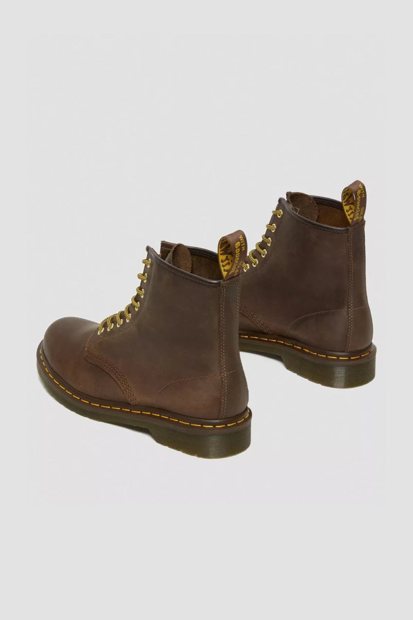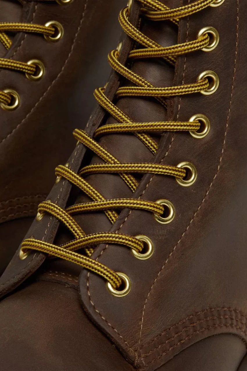 A new leather for an old classic: this iconic 8-eye 1460 boot is made with Crazy Horse, a solid leather with a worn, distressed look.