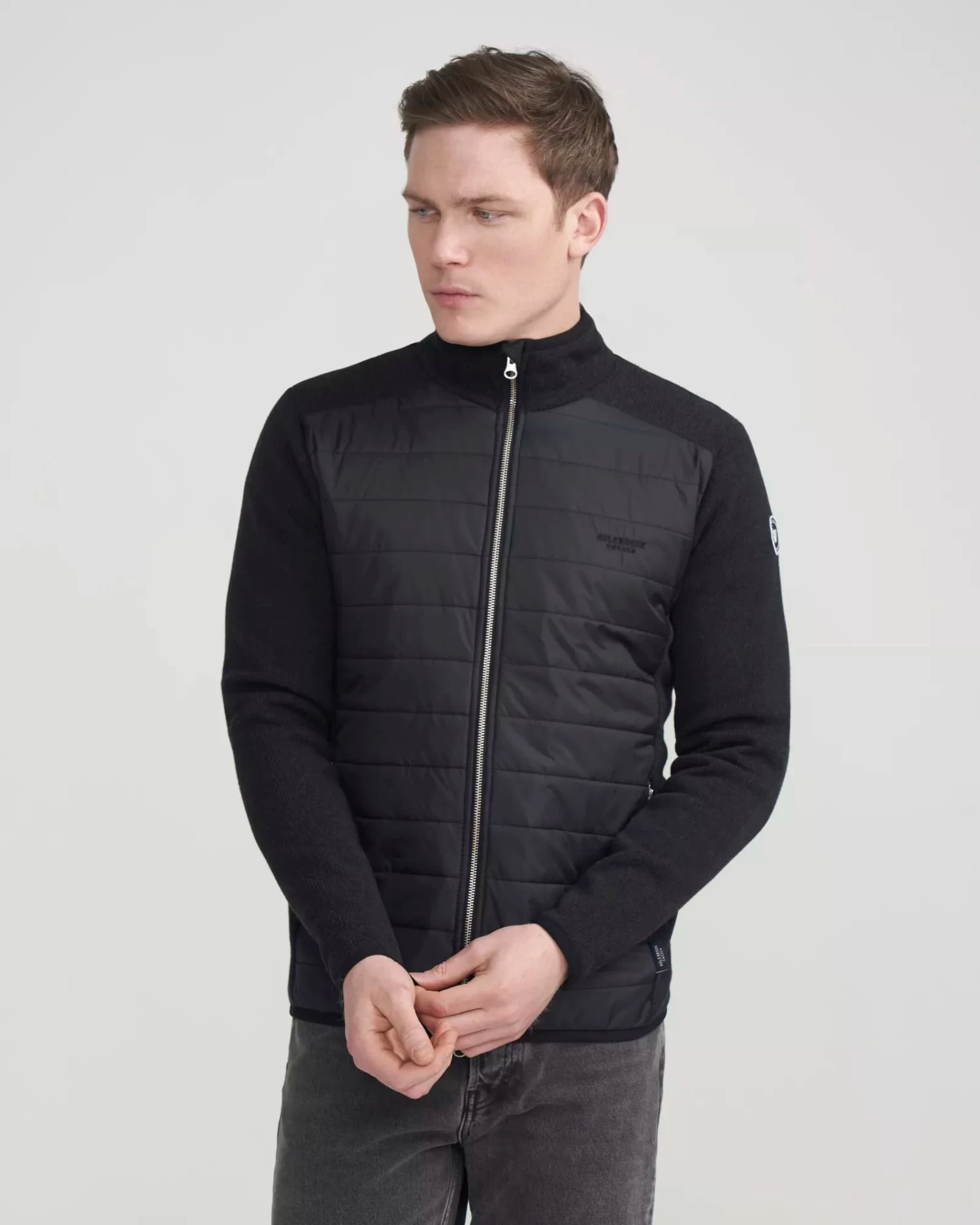 New Style! Knitted jacket in cotton with windproof lining. Quilted details in water repellent fabric. Two-way metal zip and zip pockets. With the elastic bounded edges this jacket will stay in place if you are active. This is a knitted, functional jacket.Â