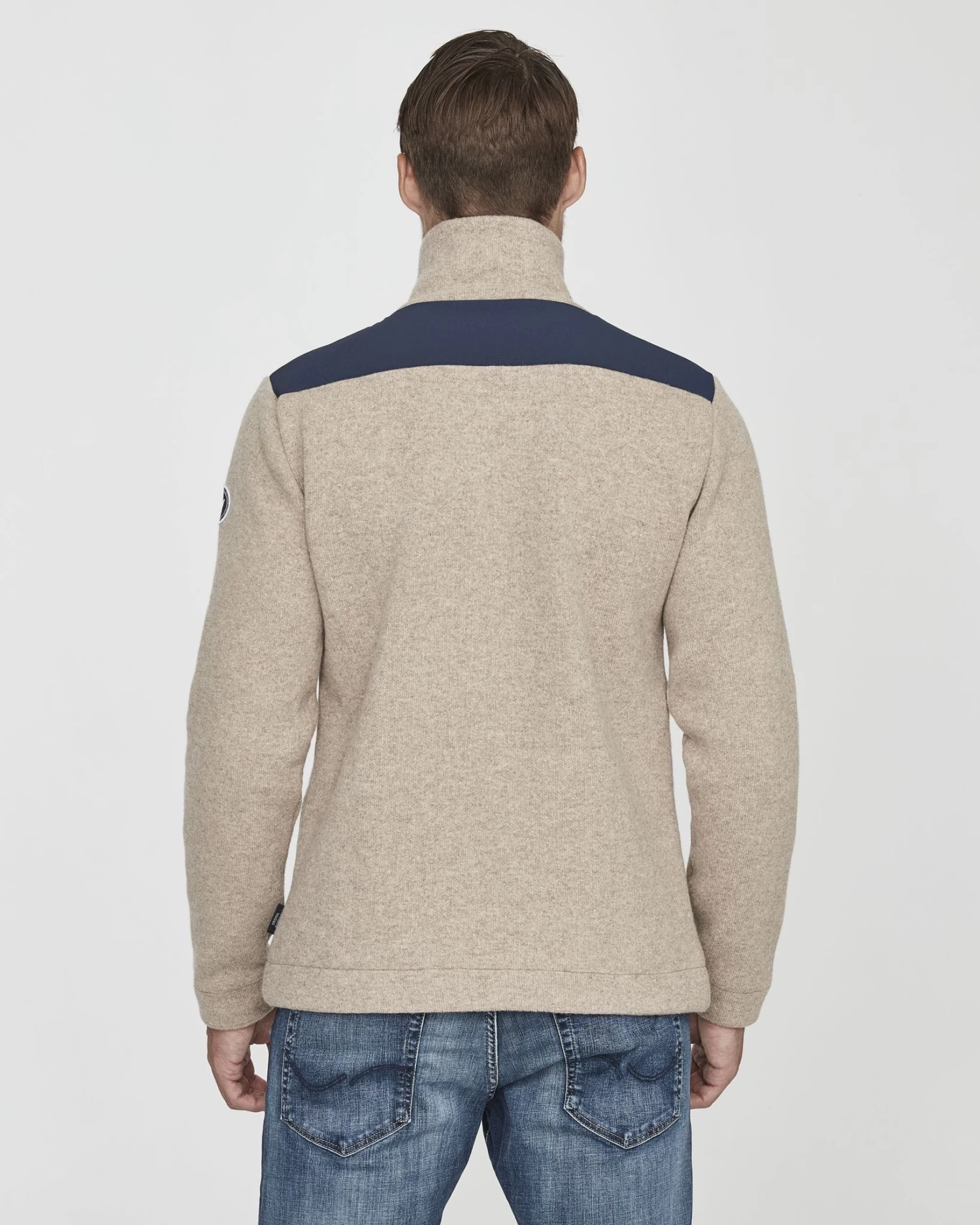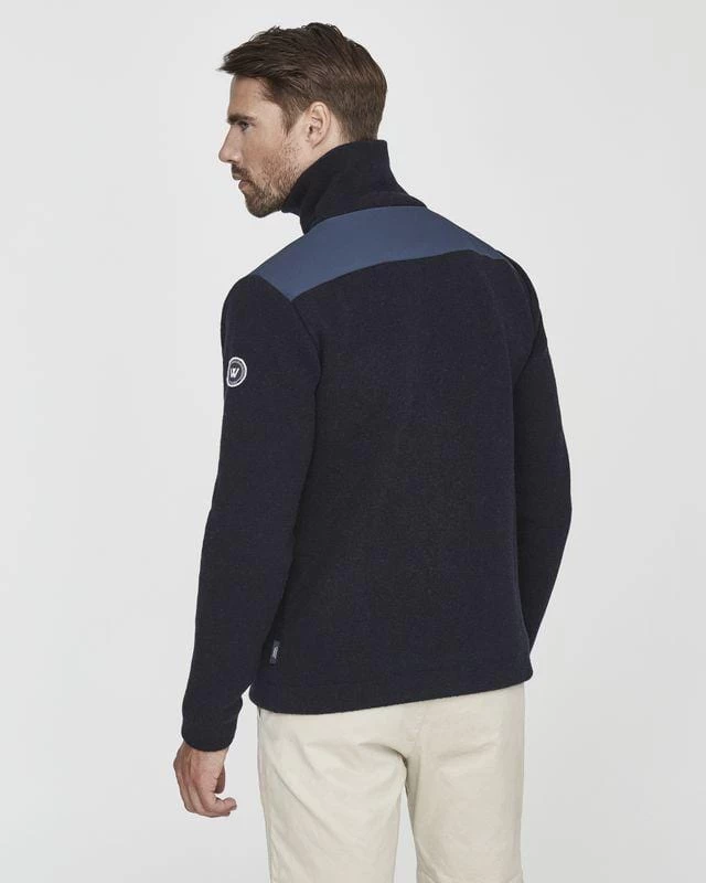 New! Knitted windproof jacket in wool blend. Two way zip and pockets with zipper. Hig collar. Water repellent details and patches. Elastic windproof lining (97%polyester, 3% elastan).
