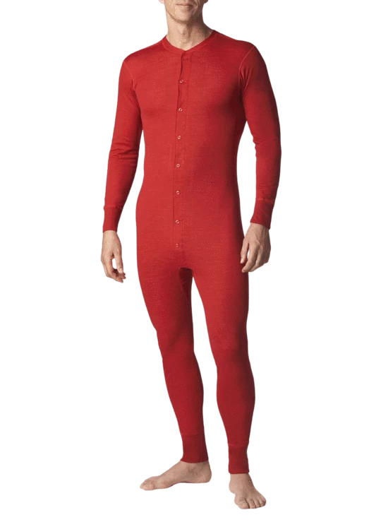 The two-layer fabric of this union suit is a unique jersey knit that offers you the ultimate in warmth and comfort. The inner layer is a blend of 50% cotton and 50% polyester for absorbency and softness. The outer layer is a blend of 50% merino wool and 50% polyester that offers you warmth and strength.